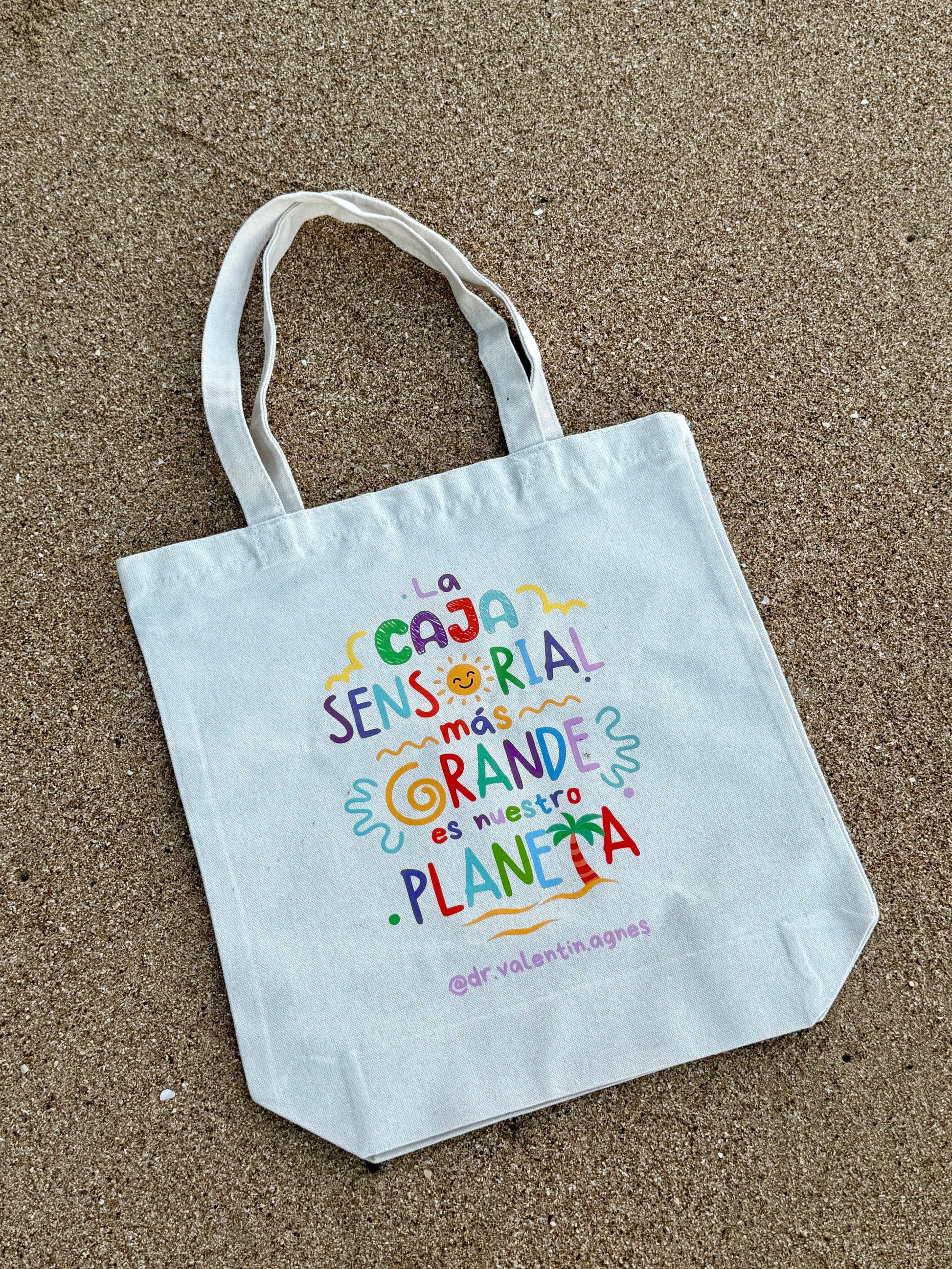 Porque el gimnasio y la caja sensorial más grande es nuestro planeta 🌍. Este tote bag te acompaña pa’ la playa, la uni o pa’ la clínica. Resistente y liviano.